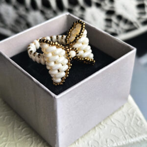 Pierścionek Kokarda Biało-Złoty z Koralików